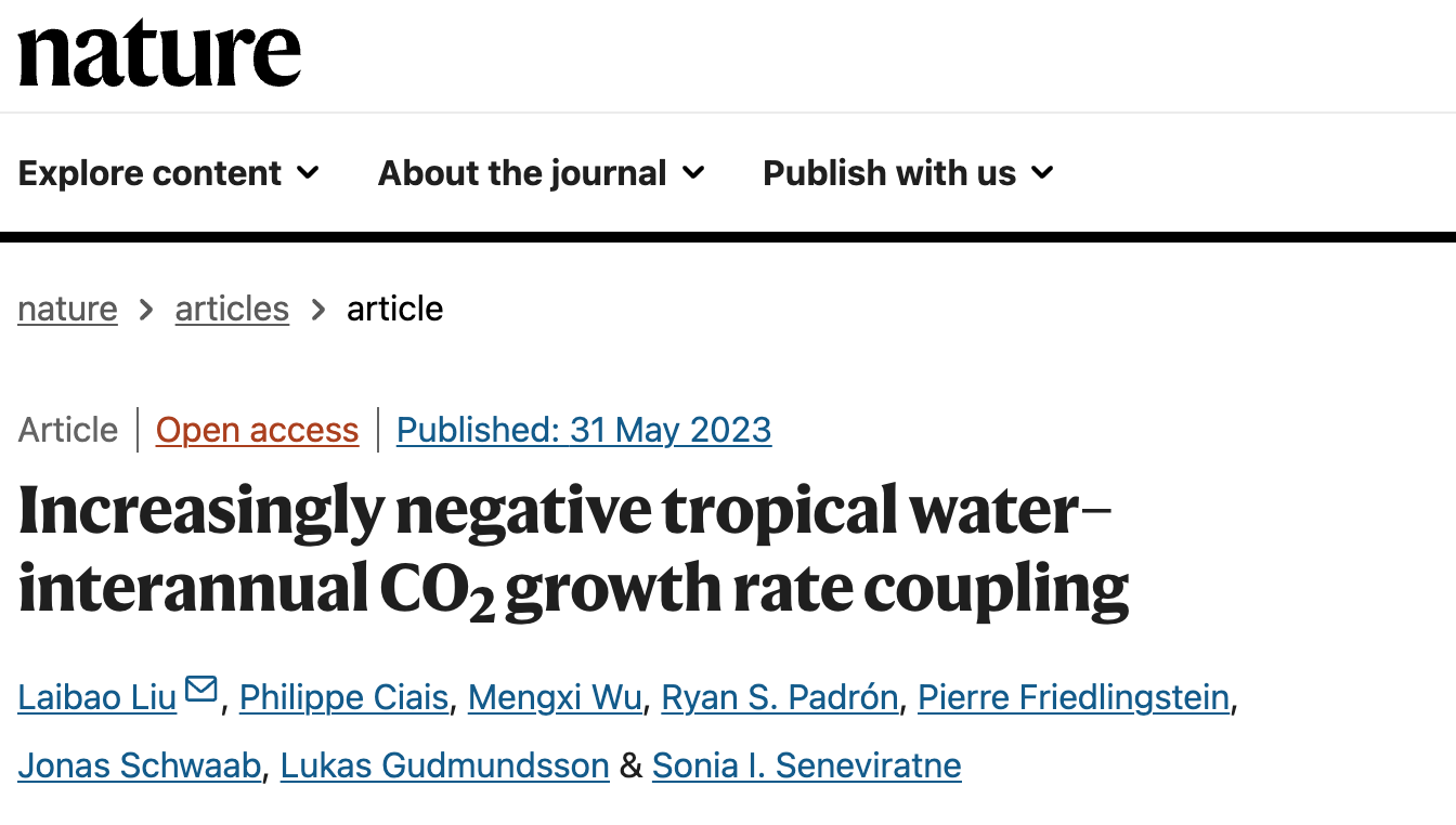 [27] Laibao Liu*, Philippe Ciais, Mengxi Wu, Ryan S. Padrón, Pierre Friedlingstein, Jonas Schwaab, Lukas Gudmundsson, and Sonia I. Seneviratne. 2023. Increasingly negative tropical water–interannual CO2 growth rate coupling. Nature 618 (7966):755-760. doi: 10.1038/s41586-023-06056-x [pdf]